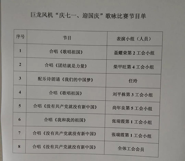 巨龍風機“慶七一、迎國慶”歌詠比賽,得到了公司領(lǐng)導的大力支持,公司各部門在百忙中組織人員積極參加活動,為活動圓滿成功舉辦增添助力!