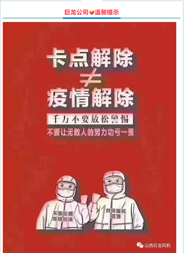 上一篇:《山西巨龍?風機有限公司》成立“疫情防控領(lǐng)導(dǎo)小組”為下一步防控工作打下良好基礎(chǔ)!